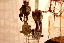 A trilogy that illustrates different stages of a man´s life: childhood, adolescence and maturity. The artist depicts a pair of skates, symbol of the essential playfulness of children, and their love of movement and speed. The fragility of adolescence and its symbolic threshold into adult life is conveyed here by a certain translucence. It is achieved by the intertwining of coloured nets, and integrating footwear that evoke the idea of a path to be tread and the tools needed to travel along various trails, as result of decisions and options.